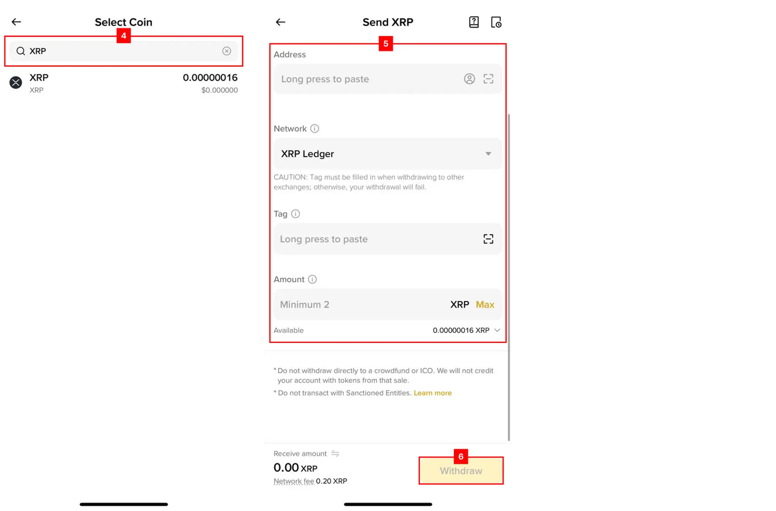 Users can select "$XRP" from their available assets or use the [Search Coin] feature to find and tap on "$XRP". Next select the desired network. In the [Withdraw Amount] field, enter the amount of XRP to send to the wallet.
